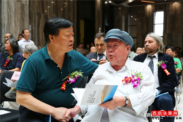 參加開幕式的著名老藝術家劉文西(圖右)和王西京親切交談。