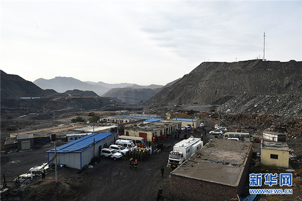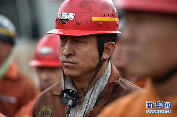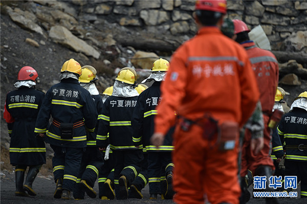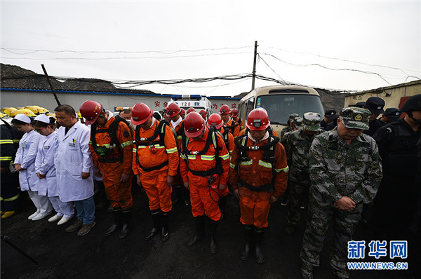 10月11日,在寧夏石嘴山市林利煤礦,現場搜救工作暫停后救援人員進行集體默哀。