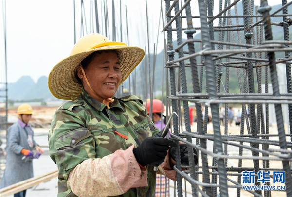 工人在廣西都安瑤族自治縣八仙易地扶貧搬遷安置新區工地施工中。