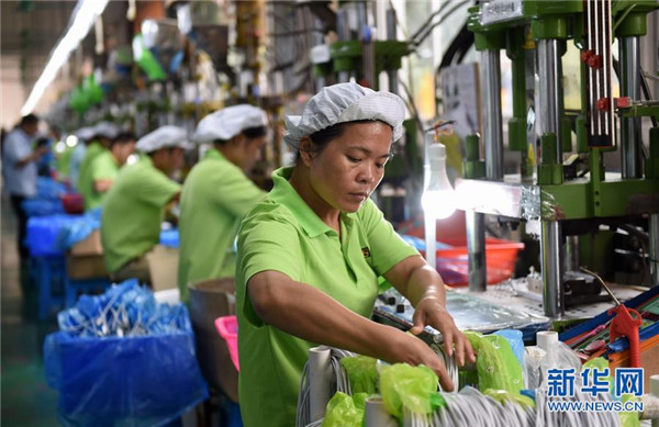 廣西都安瑤族自治縣農民進城創業園一家企業的工人在生產作業中。