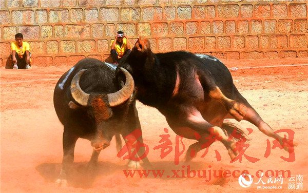 比賽當天,吸引了石林周邊十里八鄉的4000余名觀眾前來“觀戰”。賽場上,《西班牙斗牛士進行曲》旋律緊湊,一場場精彩刺激的“戰斗”此起彼伏,斗挑、追逐、角力……讓人想起歷史悠久的西班牙斗牛。與西班牙斗牛不同的是,西班牙斗牛重在人和牛之間的比拼,而石林斗牛看的是牛與牛之間的比拼。“一般人看斗牛是看熱鬧,而實際上斗牛主要是看它們不到最后一口氣絕不放棄的拼搏過程。”石林縣政協副主席劉琴龍說,這也代表了石林人民的拼搏精神。