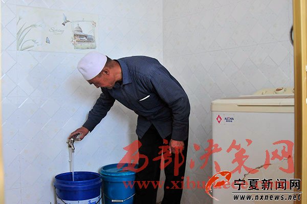 在海原水務局曹洼水利工作站站長牛志遠的帶領下,我們來到了白崖村村民馬正海的家。這是個干凈整潔的院落,兩間并排的磚瓦房,步入屋內,馬正海正在教老伴如何使用洗衣機。“50多歲了第一次用洗衣機,還不會操作呢” ,馬正海的老伴笑著說,“今年4月家里通上自來水,前陣子就去買了臺洗衣機,這在之前想都不敢想。”