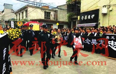 25日晚上,樊龍的遺體告別儀式在武都區(qū)公安局巡警大隊大院舉行。省公安廳派人專程為樊龍送行,隴南市、武都區(qū)公安民警代表及隴南市、區(qū)有關(guān)單位領(lǐng)導(dǎo)、職工、各界群眾代表、樊龍生前親朋好友,當?shù)厥忻窦娂娮园l(fā)趕來參加遺體告別儀式,挽聯(lián)和花圈擺滿了巡警大隊的院子。