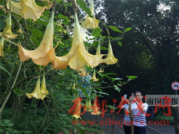 “南瓜花不是長在藤蔓上的嗎,怎么這些‘南瓜花’都倒吊著長在了樹枝上?”昨日,柳州市龍潭公園里的不少游客,都被路旁一種奇異的開花樹木所吸引,紛紛駐足觀賞拍照。記者了解到,那是公園新近引種的木本曼陀羅,因為屬于有毒植物,市民前往觀賞時,最好眼看手勿動。