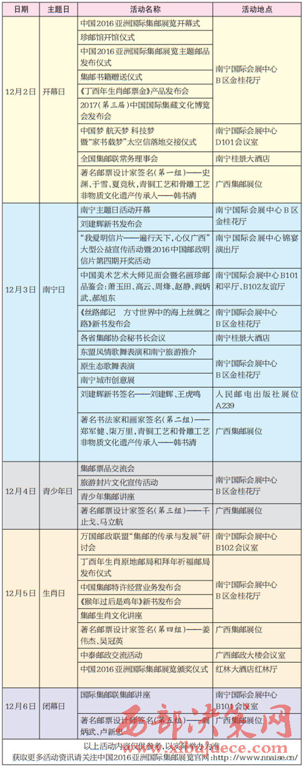 中國2016亞洲國際集郵展覽即將于12月2日—6日在南寧舉行,除了精彩的競賽性和非競賽性展品,郵展期間還將舉辦生肖郵票展示和主題郵局展示等相關活動。展會還特別設定了開幕日、南寧日、青少年日、生肖日、閉幕日五個主題日,下面就來看看每個主題日都有哪些豐富的活動吧。