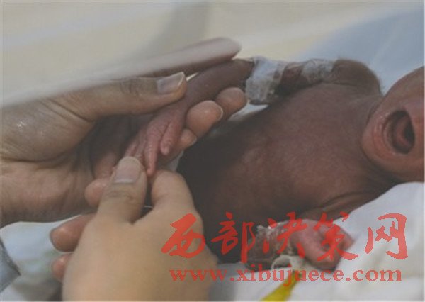 在三醫院婦兒病區新生兒重癥監護室的保溫箱里,成都商報記者見到了這位“巴掌公主”,護士們正在給她做新生兒撫觸按摩,記者看到,小家伙通體發紅,腿僅比護士的手指粗一點,手掌和護士的一截大拇指差不多大,她眼睛微張,好奇地張望著周圍的一切。