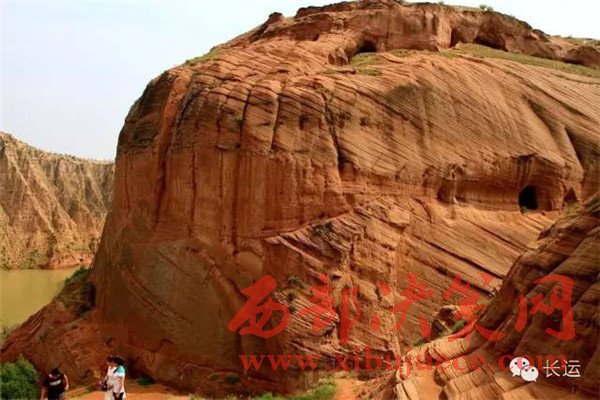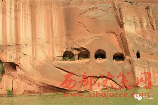 閆寨子,遠眺是快巨大的紅石頭,巋巍屹立,綠水環繞,可謂龍洲“赤壁”,離地面百米以上建有窯洞,上下三層,三十多間。