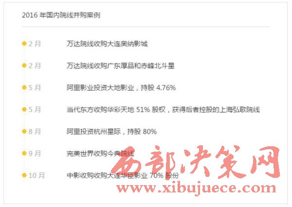 6年前,萬達院線伴隨著萬達商業(yè)地產(chǎn)的擴張不斷擴充自有院線。但隨著萬達的輕資產(chǎn)轉型和地域擴張的基本飽和,從去年始,萬達開始嘗試以并購的方式來擴大院線規(guī)模。2016年2月,萬達院線發(fā)布公告,宣布收購大連奧納,并將6家奧納影城一并納入麾下,同時收購了廣東厚品、赤峰北斗星兩家影投公司。8月24日,萬達院線與韓國CJ集團達成戰(zhàn)略合作,CGV影院將加盟萬達院線,同時雙方就映前廣告代理、4DX影院建設等事項開展合作。