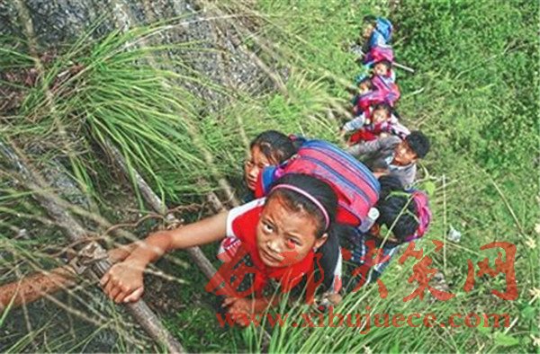 曾經,孩子們背著沉甸甸的書包,每天爬藤梯上下學。