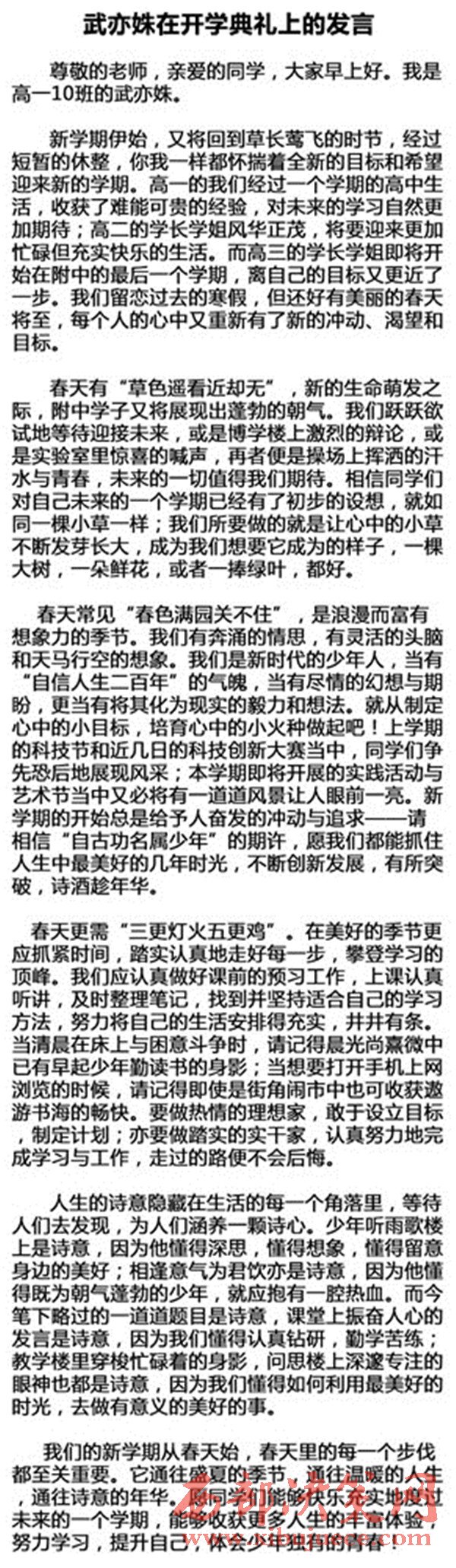 據復旦附中官網,中小學紛紛舉行開學典禮。16日上午,復旦大學附屬中學2016學年第二學期開學典禮隆重舉行。榮獲中央電視臺第二季中國詩詞大會全國總冠軍的文理學院學生武亦姝上臺發言。