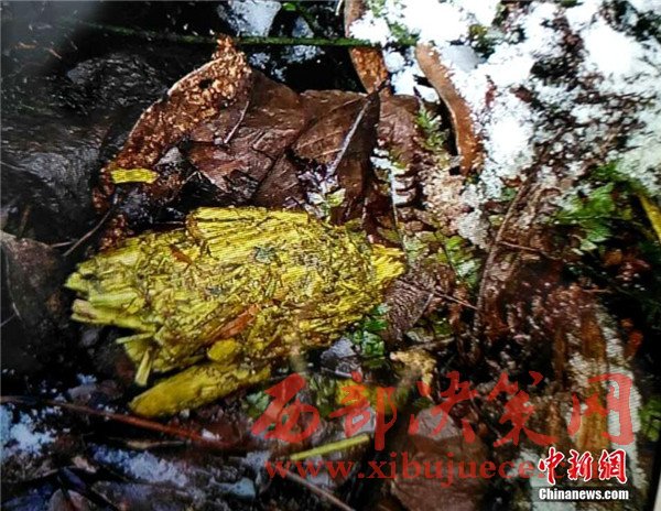 圖為馬邊縣林業工作人員在發現野生大熊貓附近雪地,找到新鮮的熊貓糞便。