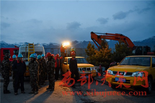 3月25日晚,救援人員在包頭市北只圖村向陽小區爆炸事故現場附近待命
