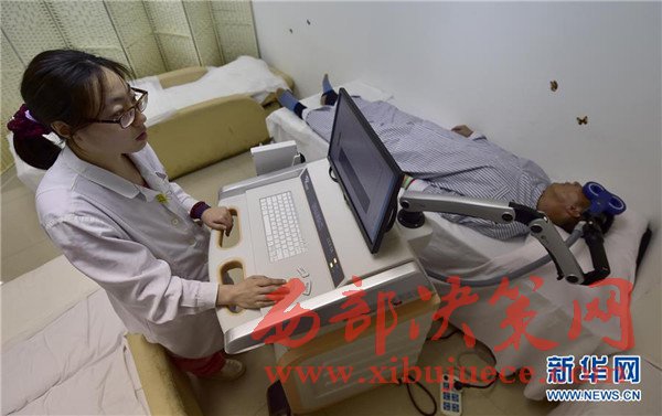 4月6日,一名抑郁癥患者(右)進行經顱磁刺激物理治療。