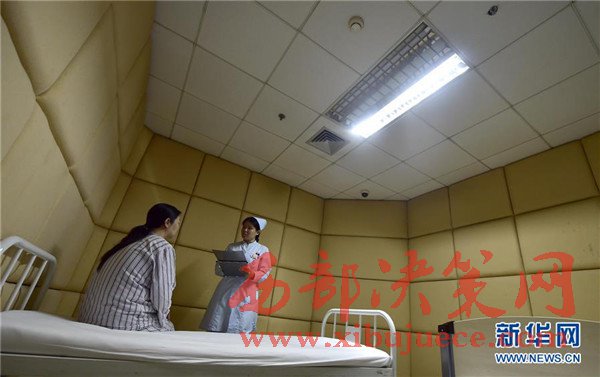 4月6日,一名護士(右)在發泄室了解抑郁癥患者的病情。