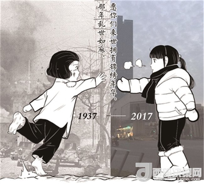 12月13日,南京大屠殺死難者國家公祭日,這一天,許多人的微博和朋友圈被一張圖片刷屏。在圖里,一名來自1937年的女孩和一名來自2017年的女孩隔空相對,彼此伸出手想要抓住對方。其中1937年里的女孩全身是灰,衣服單薄,光著雙腳,她的身旁是槍火留下的煙塵和戰爭留下的荒亂;而2017年里的女孩穿著暖和的棉服,在她身后,是現代的高樓和干凈的街道。兩人的中間寫有一行字,“那年亂世如麻,愿你們來世擁有錦繡年華”。