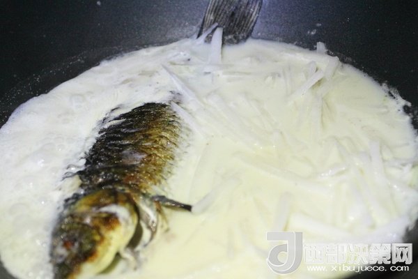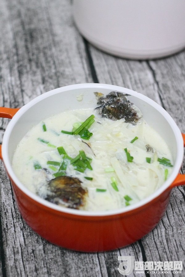 10、加入白蘿卜絲繼續中小火慢慢燉至湯汁變得更加濃稠和奶白狀態時出鍋,出鍋前5分鐘左右加入適量鹽調味,出鍋后撒上蔥花。
