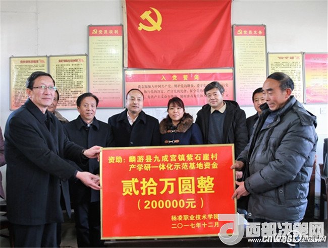 12月15日,為為貫徹落實 《全省脫貧攻堅 2017冬季行動方案》精神,扎實推進高校結(jié)對幫扶“雙百工程”,有效地為當?shù)靥厣a(chǎn)業(yè)服務(wù),楊凌職業(yè)技術(shù)學(xué)院黨委書記趙曼、黨委副書記任得元一行來到麟游縣九成宮鎮(zhèn)紫石崖村,為該村捐贈20萬元,用于建立中蜂養(yǎng)殖產(chǎn)學(xué)研一體化示范基地、核桃豐產(chǎn)栽培產(chǎn)學(xué)研一體化示范基地及電商網(wǎng)絡(luò)平臺。