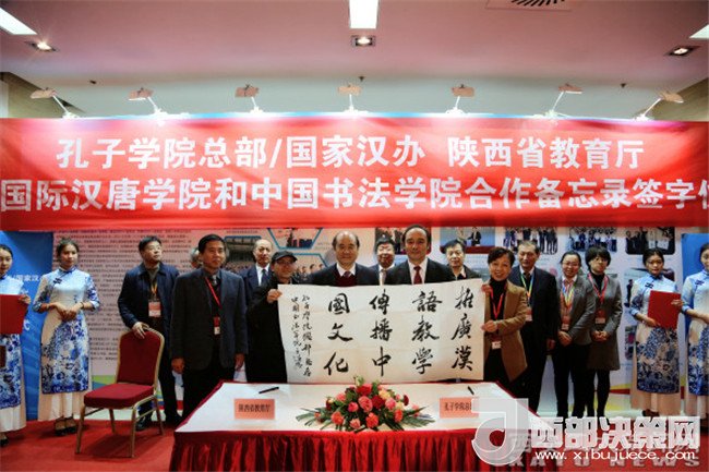 為更好的傳播中國傳統(tǒng)文化、推進(jìn)教育資源共享,實現(xiàn)與孔子學(xué)院內(nèi)外互補(bǔ)的中國文化交流傳播格局。12日下午,孔子學(xué)院總部、國家漢辦、陜西省教育廳舉行了共建中國書法學(xué)院和國際漢唐學(xué)院的合作備忘錄簽字儀式。備忘錄由孔子學(xué)院總部、國家漢辦副總干事趙國成先生和陜西省教育廳副廳長劉建林先生共同簽署。簽字儀式由陜西省教育廳國際交流處副處長文通主持,國家漢辦和陜西省教育廳有關(guān)部門的領(lǐng)導(dǎo)以及我校黨委副書記、校長雷亞萍,西北大學(xué)副書記、副校長賈明德,中國書法學(xué)院院長于唯德,西安工業(yè)大學(xué)、西北大學(xué)有關(guān)部門的領(lǐng)導(dǎo)和師生代表參加了簽字儀式。