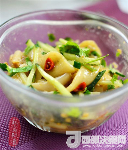 5.加入香菜末、調料、黃瓜切細絲也放入。拌勻即可食用。