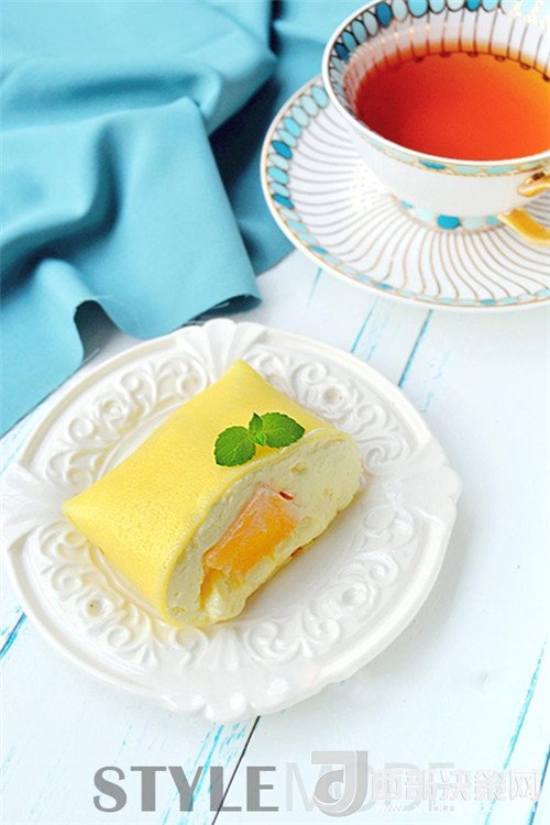 6.攤好皮冷卻后用勺子盛入適量打發的淡奶油,再加入一塊芒果肉,折疊成四方狀,收口朝下,完工。