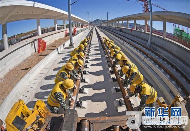 中鐵十九局工程人員在京沈高鐵凌源南站進行鋪軌作業(9月28日攝)。(記者 楊青 攝)