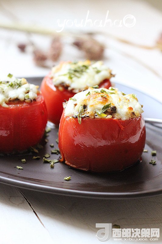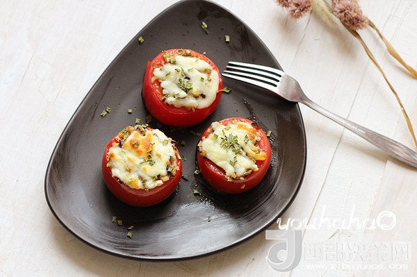 7、到時(shí)取出烤盤,西紅柿裝盤,撒少許的干蔥即可。