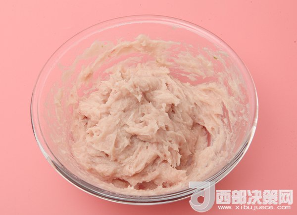 3、調入少許鹽、淀粉、蛋清攪拌均勻。然后加入水(比例大概魚3:水1),用筷子順著一個方向攪拌上勁。