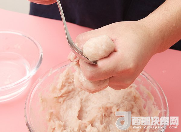 4、準備一鍋冷水開始擠魚丸,拇指先在虎口處滑一下,把魚茸磨平,這樣擠出來的魚丸就會光滑。然后往上擠,用另一只手拿勺子接一下魚丸。