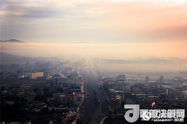 1月18日電1月18日,廣西上思縣城出現了平流霧奇觀,在朝陽渲染下的金黃色霧氣在低空緩緩地流動,樓房在霧氣中若隱若現,宛若仙境。