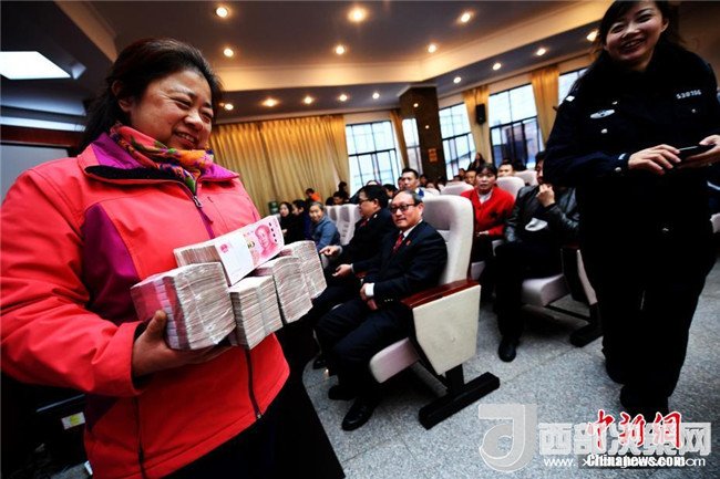 1月23日,發(fā)放現(xiàn)場滿臉笑容的市民抱著領(lǐng)到的現(xiàn)金。當(dāng)日,在2018年春節(jié)臨近之際,昆明市五華法院“法威行動(dòng)”執(zhí)行案款暨司法救助金集中發(fā)放在五華法院進(jìn)行。共對107件涉民生、涉金融案件發(fā)放執(zhí)行案款約5000萬元,同時(shí)對13起執(zhí)行案件中的14名特困人員發(fā)放司法救助金346000元。此次集中發(fā)放案款暨司法救助金大會(huì),旨在彰顯司法的權(quán)威和司法的人文關(guān)懷,確保申請執(zhí)行人和特困人員的合法權(quán)益得到及時(shí)兌現(xiàn),讓民眾過上一個(gè)歡樂祥和的新春佳節(jié)。記者李進(jìn)紅攝