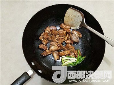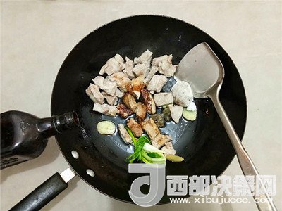 5.鍋中放少許油,放入焯過水的排骨稍微炒一下,放入生抽、老抽、冰糖、燉肉料包、生姜、香蔥等調料