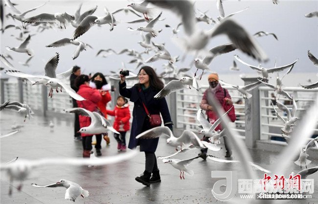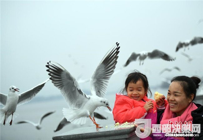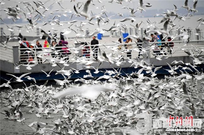 2月4日,人們穿著厚厚的冬裝在昆明滇池邊給紅嘴鷗喂食。當日,受較強冷空氣影響,“春城”昆明最低氣溫下降至-3℃。天氣雖然寒冷,卻抵擋不住市民和游客前來滇池觀賞、喂食越冬紅嘴鷗的熱情。中新社記者李進紅攝