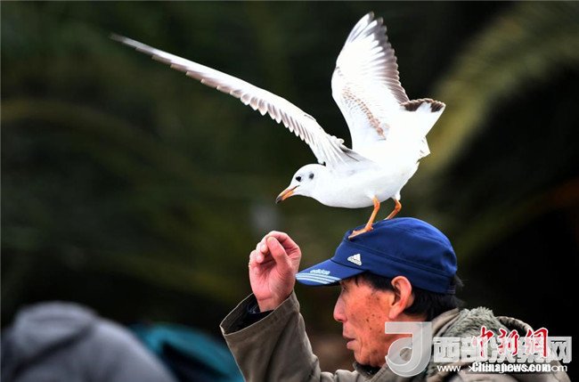 2月4日,一名市民在昆明滇池邊給飛上頭頂的紅嘴鷗喂食。當日,受較強冷空氣影響,“春城”昆明最低氣溫下降至-3℃。天氣雖然寒冷,卻抵擋不住市民和游客前來滇池觀賞、喂食越冬紅嘴鷗的熱情。中新社記者李進紅攝