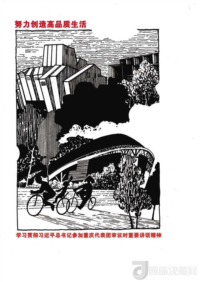 另一組負責“創造高品質生活”的師生也遭遇類似的問題。最初師生們想用一組市民在公園鍛煉的場景來闡述這個主題,但很快就發現這樣的畫面太簡單蒼白。最終,他們將重慶大劇院、重慶美術館、奧體中心等重慶的標志性建筑作為文化符號列入畫稿中,才有了令人耳目一新的感覺。