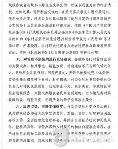 各級(jí)各部門對管轄范圍內(nèi)大操大辦、相互攀比、鋪張浪費(fèi)、封建迷信等不良風(fēng)氣聽之任之,導(dǎo)致群眾反映強(qiáng)烈、問題嚴(yán)重的,要依紀(jì)依規(guī)追究主體責(zé)任、監(jiān)督責(zé)任和相應(yīng)領(lǐng)導(dǎo)責(zé)任。村黨組織、村委會(huì)和村務(wù)監(jiān)督委員會(huì)負(fù)責(zé)人對村民說服教育、勸阻制止不力,失職失責(zé),導(dǎo)致轄區(qū)內(nèi)發(fā)生違規(guī)操辦、大操大辦婚喪喜慶事宜問題的,由鄉(xiāng)鎮(zhèn)紀(jì)委對其提醒約談、通報(bào)問責(zé),問題嚴(yán)重的給予黨紀(jì)政務(wù)處分。