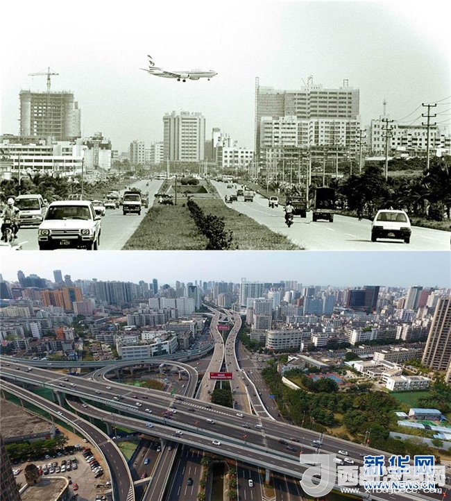 拼版照片為海口市國興大道,曾經是海口大英山機場(上圖為1999年5月新華社記者姜恩宇攝,下圖為2018年4月14日新華社記者郭程攝)。