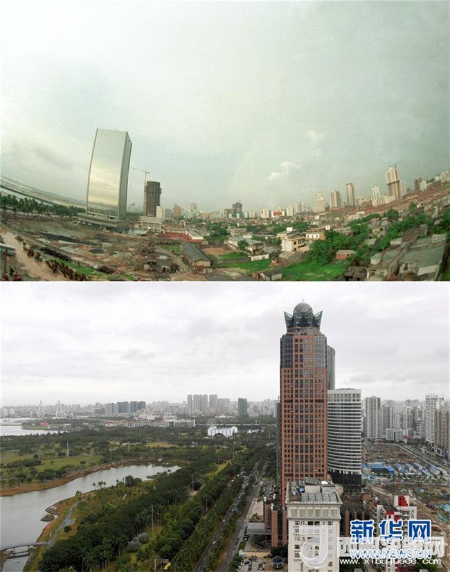 拼版照片為海口市濱海大道南側的建筑物今昔對比(上圖為1990年1月10日新華社記者姜恩宇攝,下圖為2018年4月15日新華社記者趙穎全攝)。