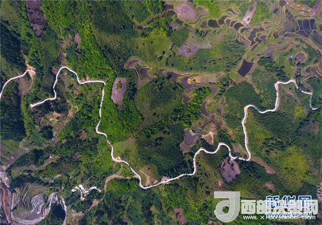 這是借助無人機拍攝的融水苗族自治縣桿洞鄉黨鳩村公路(4月17日攝)。