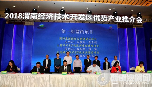 省質監局質量監督處處長張泉生,市食藥局黨組書記、局長王建軍,市商務局副局長李爭良、市工信局副局長孟宗憲,市外經局副局長郭向陽、市質監局總工程師井西娥等省市領導出席推介會并見簽。經開區黨群工作部部長閆曉宇,管委會副主任段宏偉、馬俊玲上臺簽約。此次簽約的項目包括有總投資30億元的國藥健康文旅城項目,總投資1億元的大能年產2萬噸醫藥蕎麥酵素項目,總投資3億元的陜西順天年2萬噸農用酵素項目;總投資1.2億元的年產1萬噸功能性酵素和酵素飲品項目、總投資8000萬元的陜西宜康神年產5000噸蘆薈酵素項目和總投資6000萬元的陜西弘康生物科技股份有限公司特色植物提取項目;總投資8000萬元的綠盛農業科技有限責任公司農用酵素運營示范中心項目、總投資5400萬元的信德緣復合果蔬酵素項目和總投資6000萬元的渭南市藥材公司年產1000噸葡萄酵素項目。