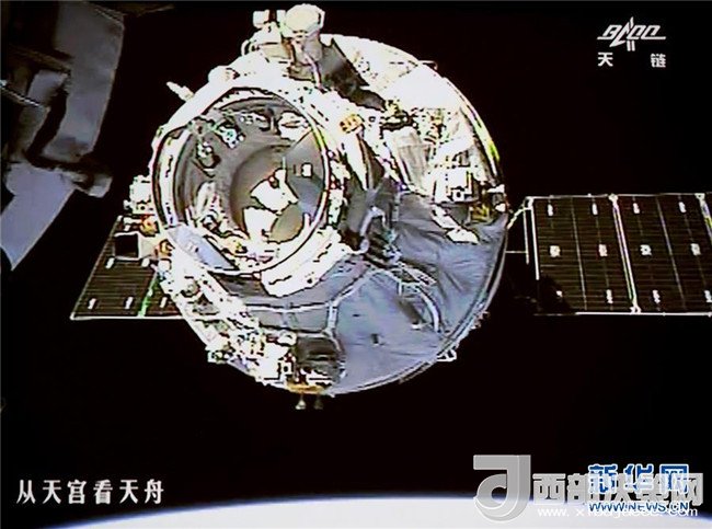 2017年4月22日12時23分,天舟一號與天宮二號順利完成自動交會對接。這是天舟一號與天宮二號進行的首次自動交會對接,也是我國自主研制的貨運飛船與空間實驗室的首次交會對接。圖為北京航天飛行控制中心大廳大屏幕上顯示的天舟一號向天宮二號靠攏的畫面(2017年4月22日攝)。新華社發(王泗江 攝)