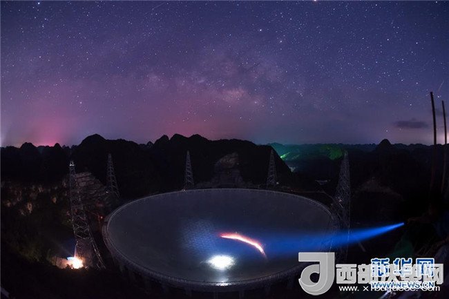 FAST在滿天繁星下呈現出的美麗景觀(2016年6月27日攝)。2017年10月10日,中國科學院國家天文臺宣布,被譽為“中國天眼”的500米口徑球面射電望遠鏡(FAST)經過一年緊張調試,已實現指向、跟蹤、漂移掃描等多種觀測模式的順利運行,并確認了多顆新發現脈沖星。新華社記者劉續攝