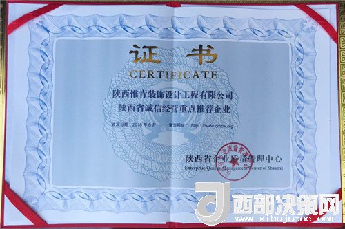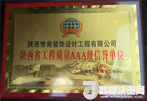 西部決策網——西部大開發訊(帥華鋒 張曉紅)近日,寶雞市惟肯裝飾榮獲陜西省企業質量管理中心頒發《陜西省工程質量AAA級信譽單位》和《陜西省誠信經營重點推薦單位》兩項榮譽稱號。