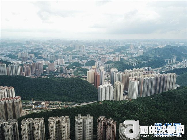 青山圍繞的貴陽市城區一隅(7月3日無人機拍攝)。