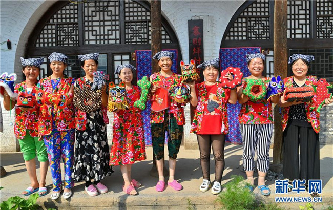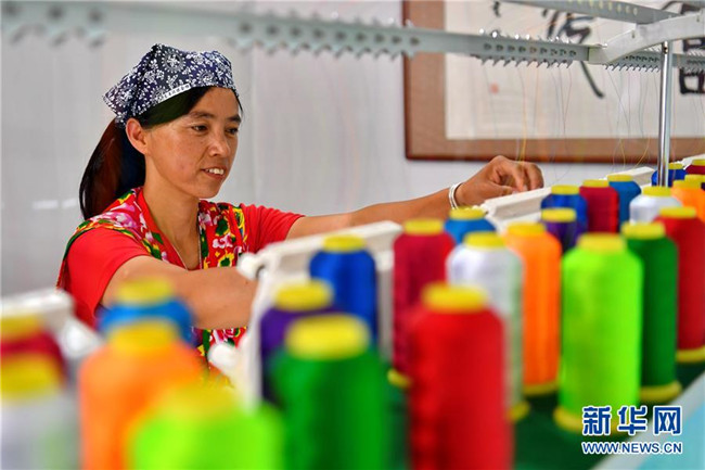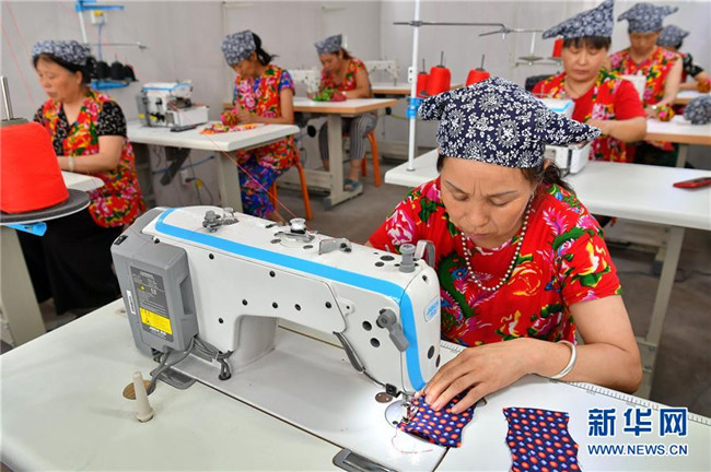 山西省臨縣寨則坪村是呂梁山上典型的貧困村。2017年5月,該村邀請縣里的老手藝人對10余位婦女進行布藝加工的集中培訓,并在村委院子里建起了布藝加工廠。靠著加工富有當地特色的鞋墊、肚兜、布老虎等工藝品,這些婦女每月能拿到1500元的工資,這幫助她們順利摘下了“窮帽子”。新華社記者 曹陽 攝