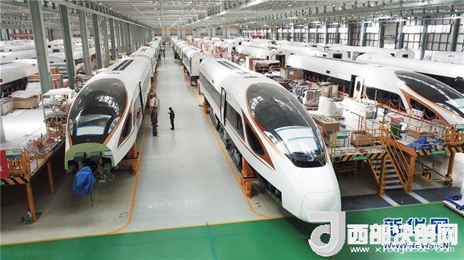 在位于吉林長(zhǎng)春的中車長(zhǎng)客股份公司高速動(dòng)車組裝配車間里,幾列“復(fù)興號(hào)”中國(guó)標(biāo)準(zhǔn)動(dòng)車組在進(jìn)行裝配(2017年9月14日攝)。新華社記者張楠攝