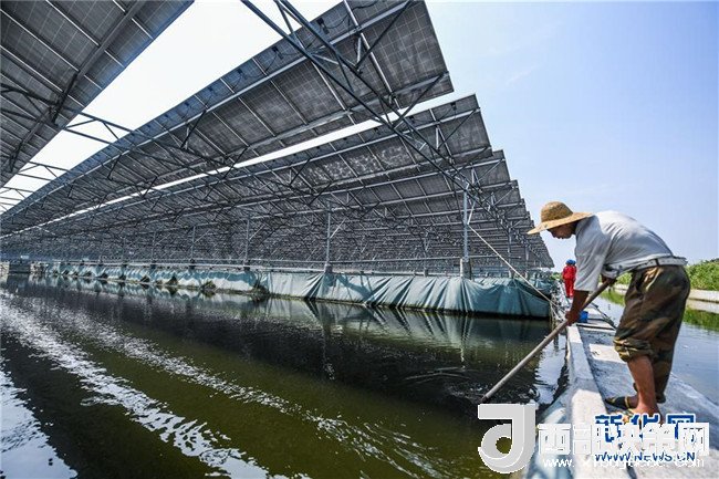 7月25日,在湖州市和孚鎮陳塔村,養殖戶清理光伏板下的魚塘內的漂浮物。