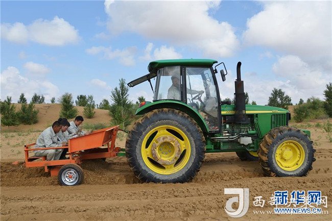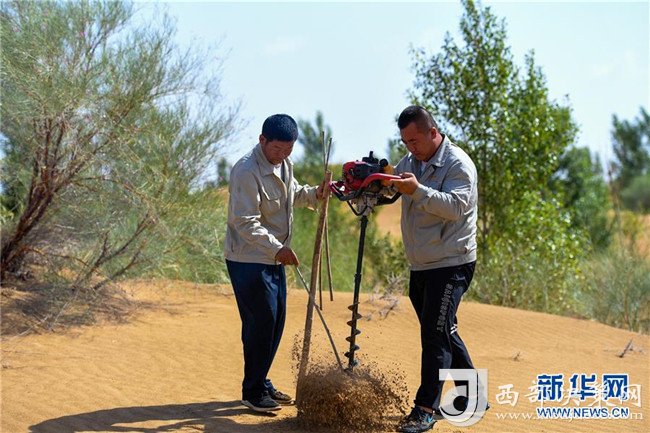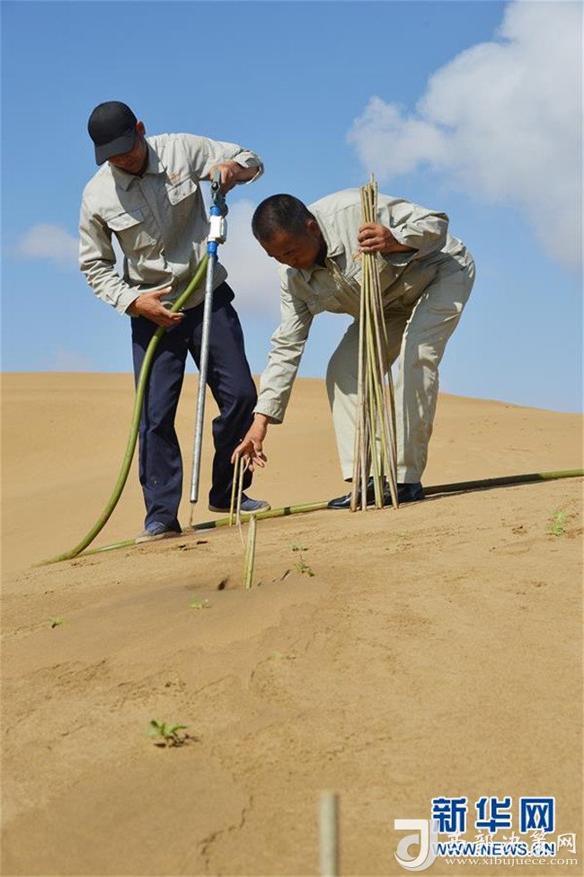 億利集團生態事業部職工在庫布其沙漠中利用螺旋鉆孔植樹法種樹(7月11日攝)。用這種方法30秒可種下一棵樹。 新華社記者 彭源 攝