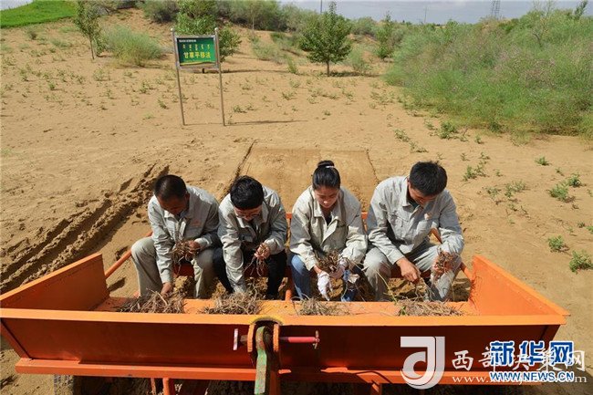 技術人員在位于內蒙古鄂爾多斯市杭錦旗的庫布其沙漠示范甘草平移法(7月24日攝)。