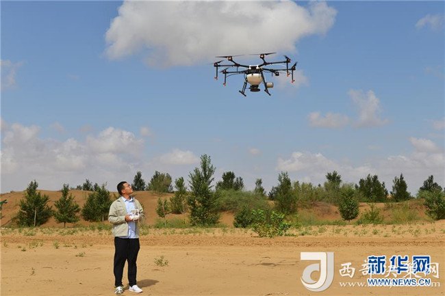 技術人員在位于內蒙古鄂爾多斯市杭錦旗的庫布其沙漠里示范無人機植樹(7月24日攝)。 新華社記者 鄒予 攝
