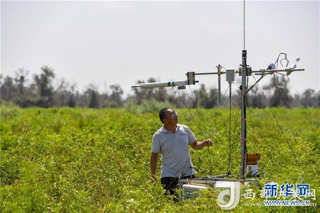 在內蒙古鄂爾多斯市的庫布其沙漠中的億利集團阿木古龍甘草健康產業園,工作人員在儀器前觀測氣候土壤條件(7月11日攝)。 新華社記者 彭源 攝